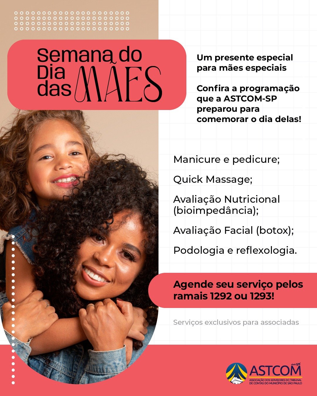 ⬇️ Entre os dias 6 e 10 de maio serão realizados e, todas as mães associadas vão poder aproveitar, de forma gratuita, os seguintes serviços: