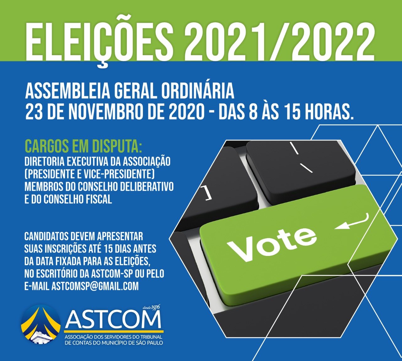 Associados e associadas que desejarem disputar as eleições para a Diretoria Executiva da Associação deverão apresentar suas inscrições por escrito até 15 dias antes da data fixada para as eleições, no escritório da ASTCOM-SP ou pelo email astcomsp@gmail.com solicitando confirmação pelos telefones (11)5080-1292/1293, ou ainda pelo whatsapp (11) 94791-3189.