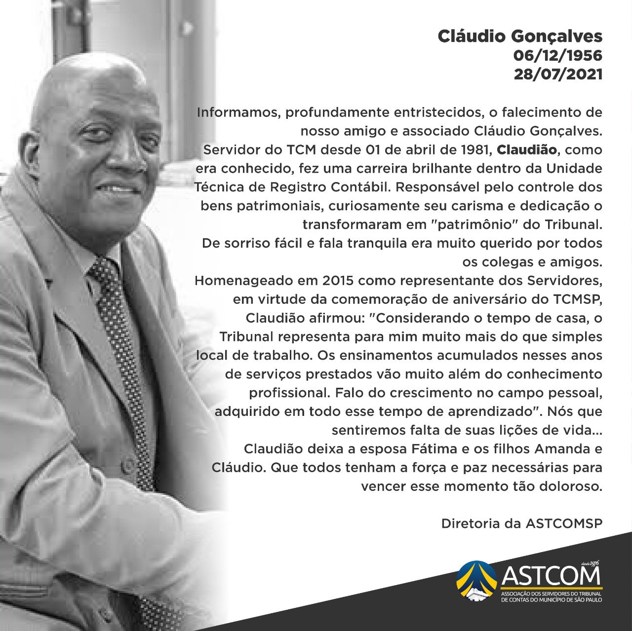 Informamos, profundamente entristecidos, o falecimento de nosso amigo e associado Cláudio Gonçalves.