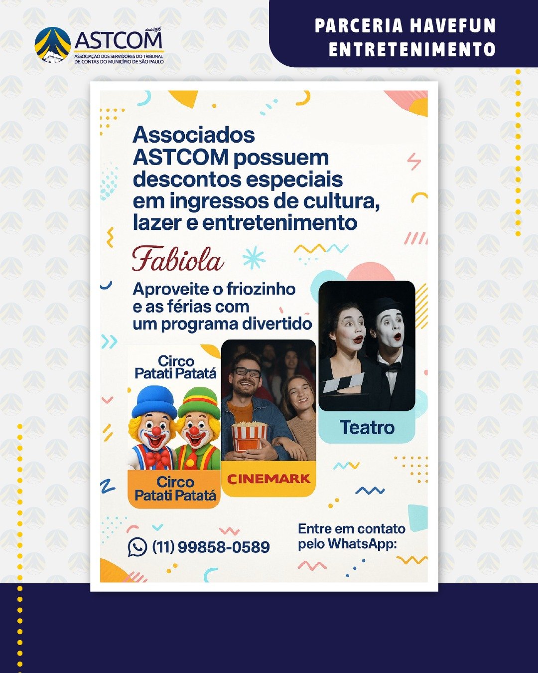 Pensando nisso, a Astcom-SP em parceria com a Havefun Entretenimento, garante descontos exclusivos para associados em diversos programas culturais e de lazer.